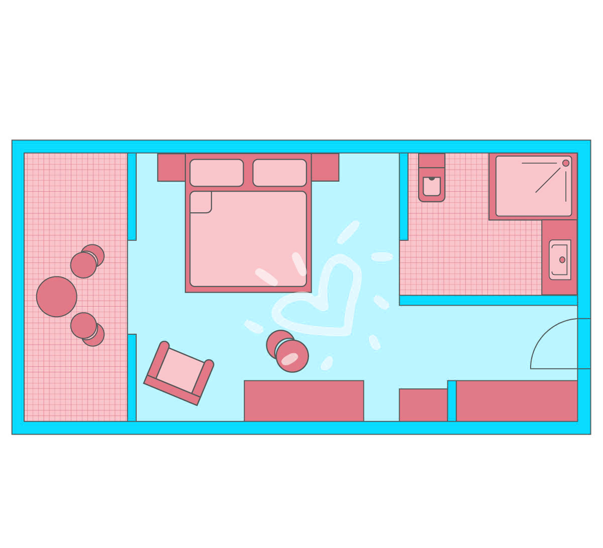 Die Zimmer sind komfortabel mit einem Doppelbett (2 m x 2 m ) eingerichtet und verfügen über Balkon oder Terrasse, WLAN (ohne Gebühr), Dusche/WC, Satelliten-TV, Radio, Föhn, Schminkspiegel, Mini-Kühlschrank, Kaffee/Teezubereiter, Safe und sind klimatisierbar/beheizbar (individuell regelbar, saisonabhängig). Alle Zimmer sind Nichtraucherzimmer. Mindestalter 18 Jahre.